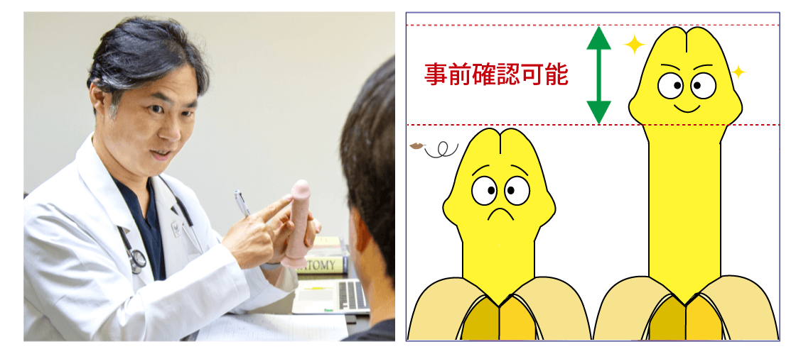 長茎術では施術前の診察時に、どれだけ長くできるか?を事前確認する事ができます。