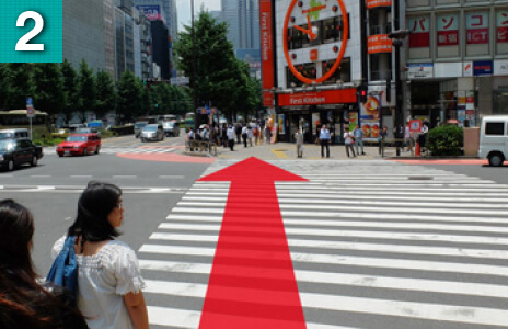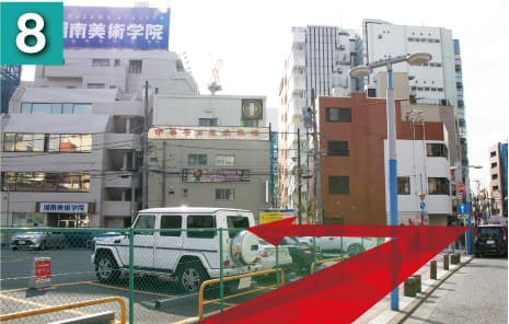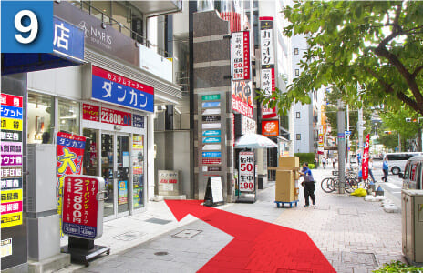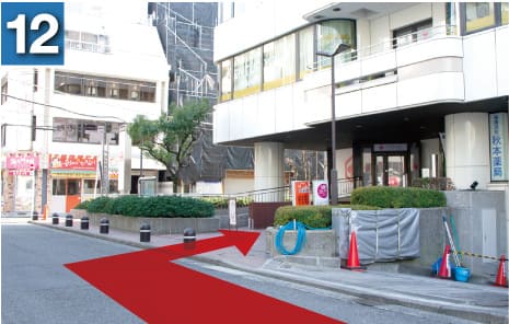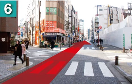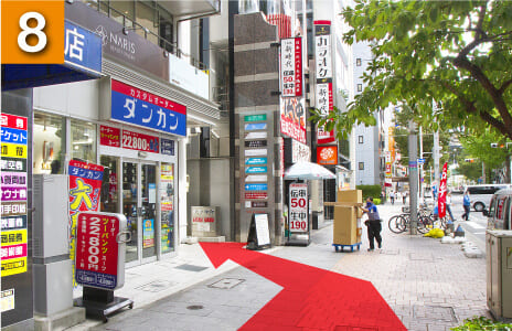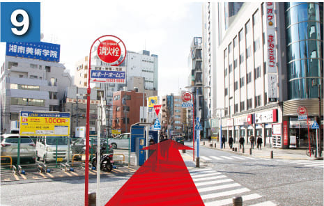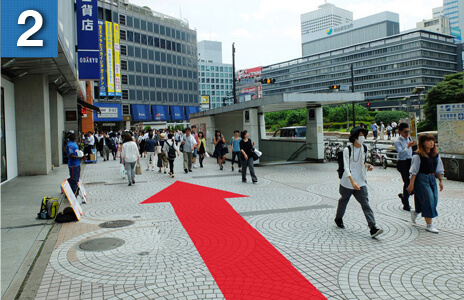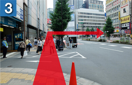 駅を右手に坂を下るようにして進んでいただき、横断歩道を渡ります。(大きな時計のあるファーストキッチンさんが目印です)