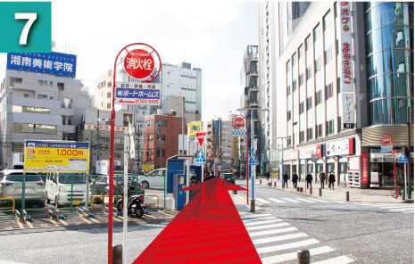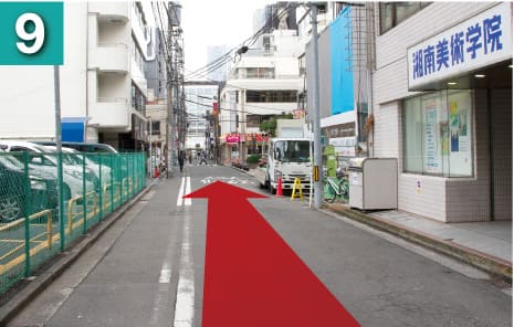 正面左側に湘南美術学院さんの看板が見え見えてきます。そのままパルナード通りを直進してください。