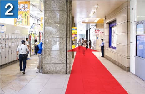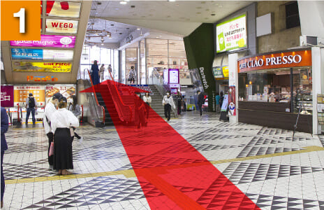 JR西口を出て、みどりの窓口の前を通り過ぎると階段がありますので登って地上へと出てください。
